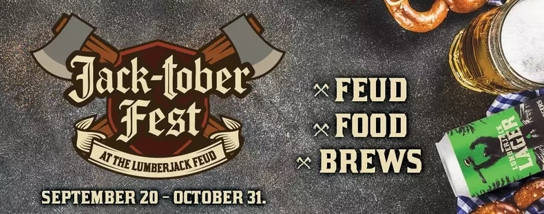Feast on our all you can eat Bavarian buffet loaded with all your Oktoberfest favorites, enjoy our brand-new Jack-toberfest beer brewed exclusively for the Lumberjack Feud, and test your Lumberjack skills in our all new pre-show beer stein-holding contest. PLUS—our show gets a seasonal twist with a brand new event. Don’t miss the Feud, Food, and Brews— at Jack-toberfest! Only at Paula Deen’s Lumberjack Feud Supper Show.